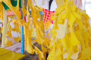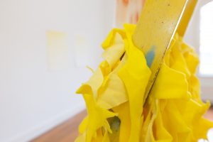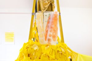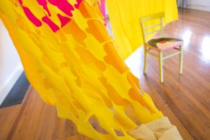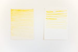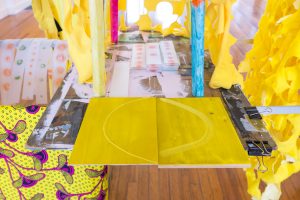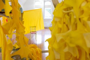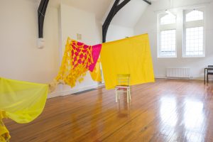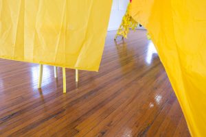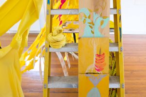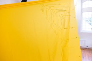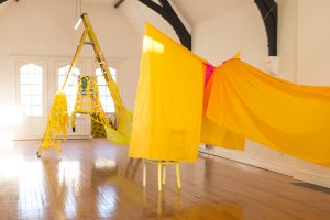 Anne-Marie McKee has used this residency to create a studio, somewhere to pick up her practice after a two year gap. Her interest is in the structure and scaffolding of a studio to produce and display art. This might be using the steps of a ladder to show drawings, it might be a place to track the movements of the sun with gouache on yellow tent material. It might be a place to take a nap. The end-of-residency exhibition celebrates the studio as a workplace, made in a spirit of enquiry and experiments in drawing.
