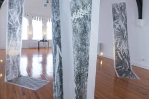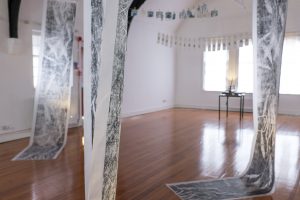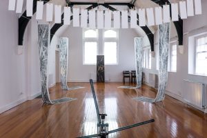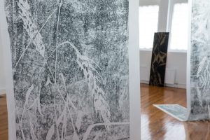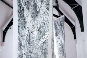 These two concepts, both utilised by religion, relate naturally to the secular process of printmaking. The artist uses her experience of the printmaking studio as a structure to create an environment in which architecture and repetition illuminate how humans create institutions; and why they seem to be so integral to us as human beings.